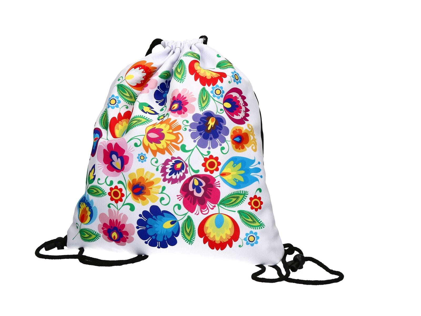 Biały worek/plecak na odzież sportową z nadrukowanym kolorowym wzorem inspirowanym wycinanką łowicką.