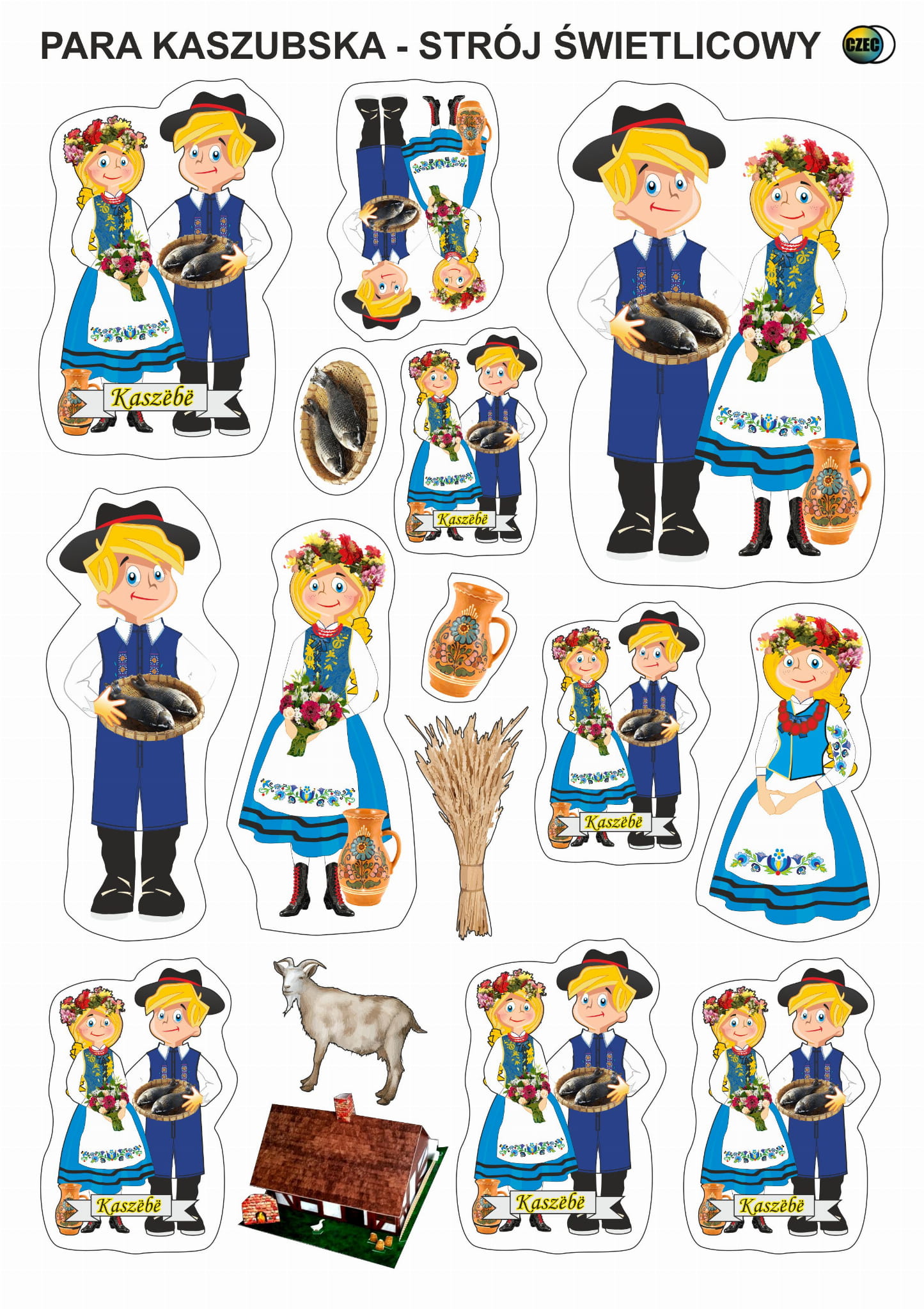 Zestaw naklejek z wzorami przedstawiającymi parę w kaszubskich strojach ludowych.