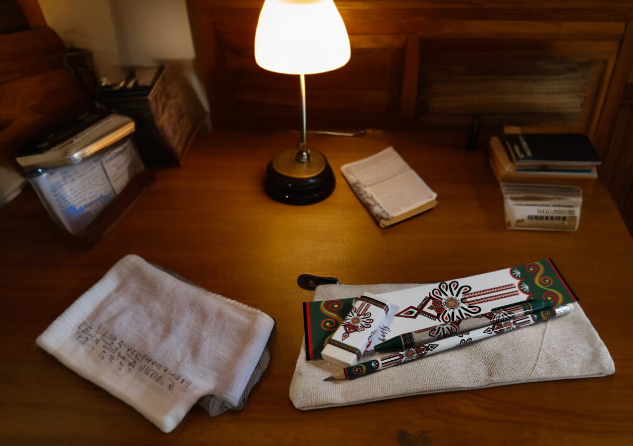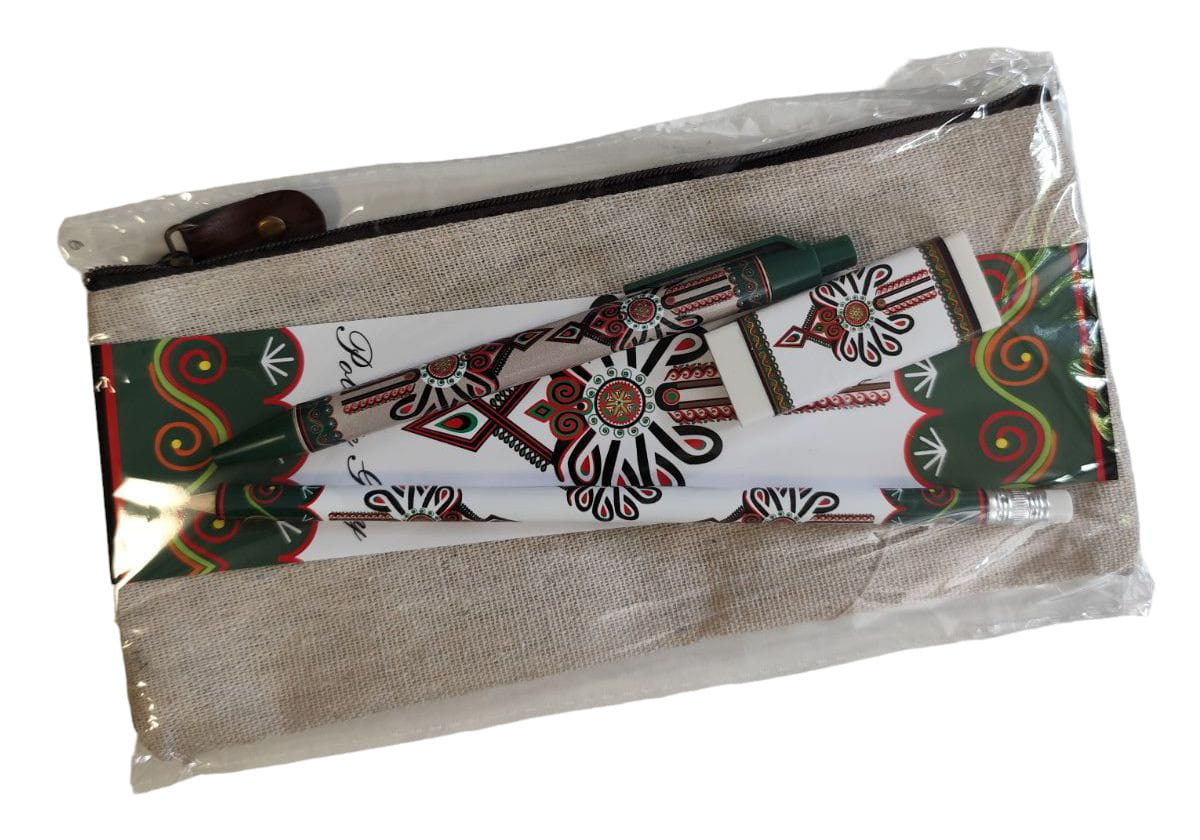 Zestaw zawiera ołówek, długopis, gumkę do mazania oraz zakładkę - wszystkie ozdobione wzorem inspirowanym tradycyjną góralską parzenicą. Całość zapakowana w piórnik - saszetkę.