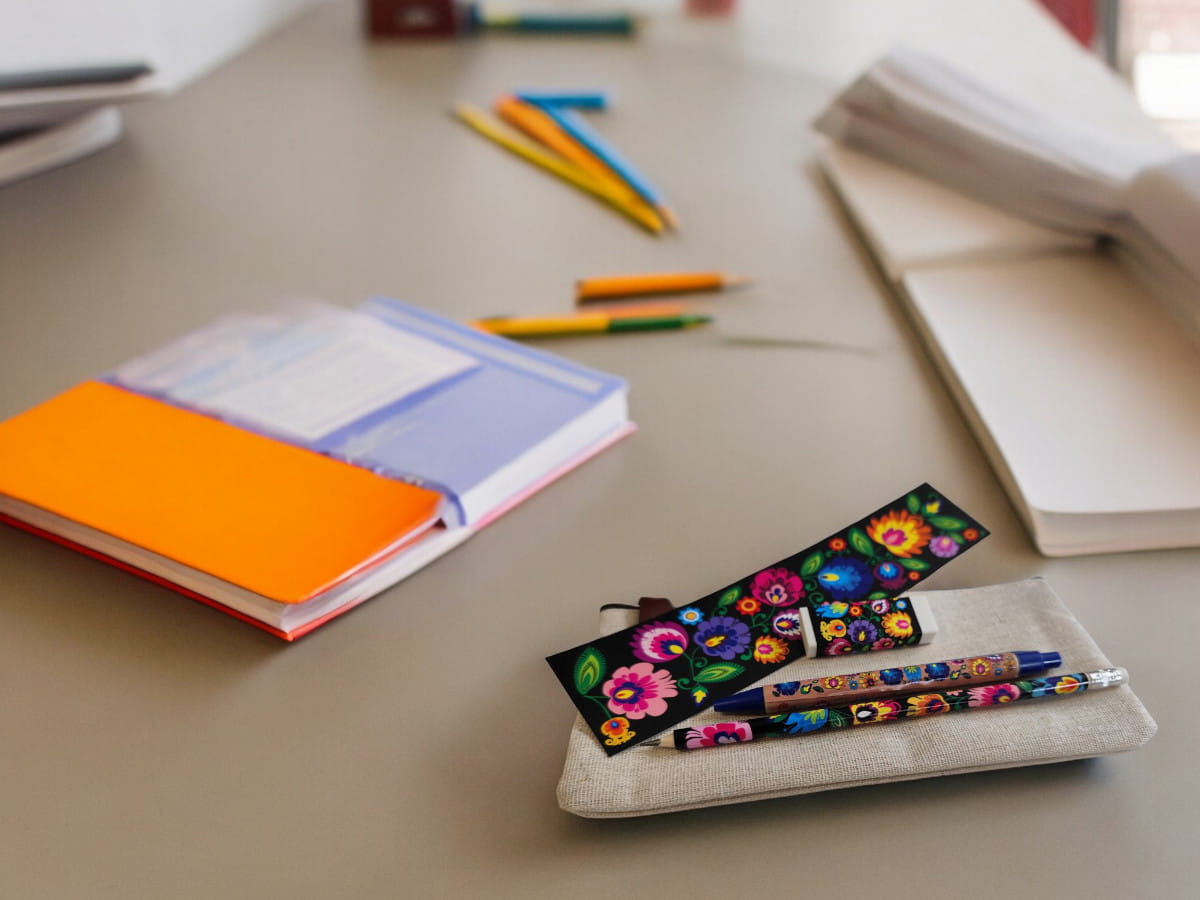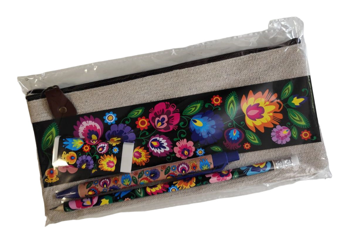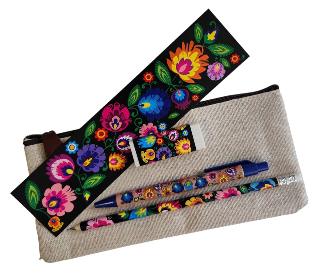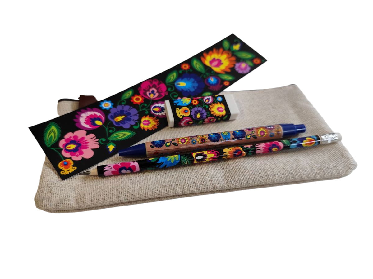 Zestaw zawiera ołówek, długopis, gumkę do mazania oraz zakładkę - wszystkie ozdobione wzorem kwiatowym inspirowanym wycinanką łowicką. Całość zapakowana w piórnik - saszetkę.