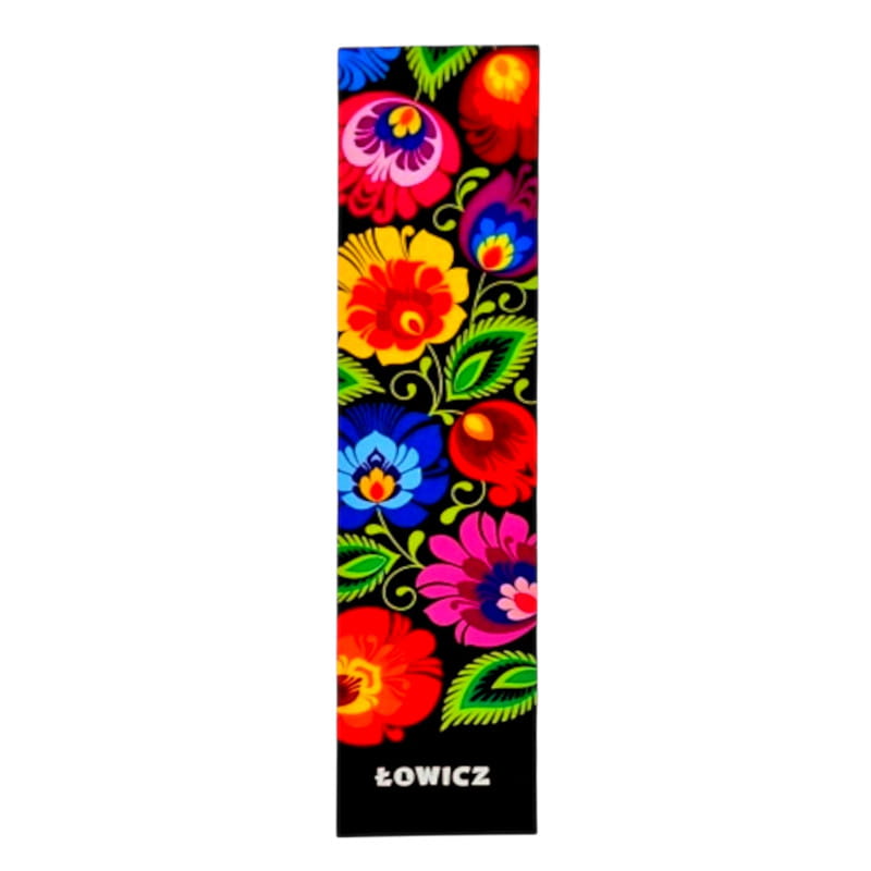 Czarna folkowa zakładka do książki z wzorami kwiatowymi inspirowanymi wycinanką łowicką.