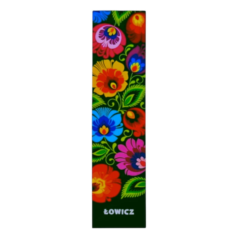 Zielona folkowa zakładka do książki z wzorami kwiatowymi inspirowanymi wycinanką łowicką.
