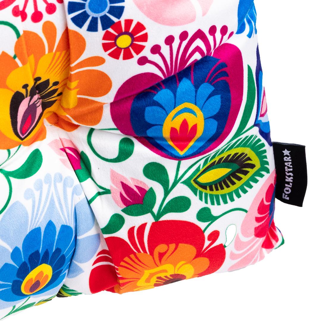 Biała poduszka dekoracyjna na krzesło z wzorami inspirowanymi wycinanką łowicką.