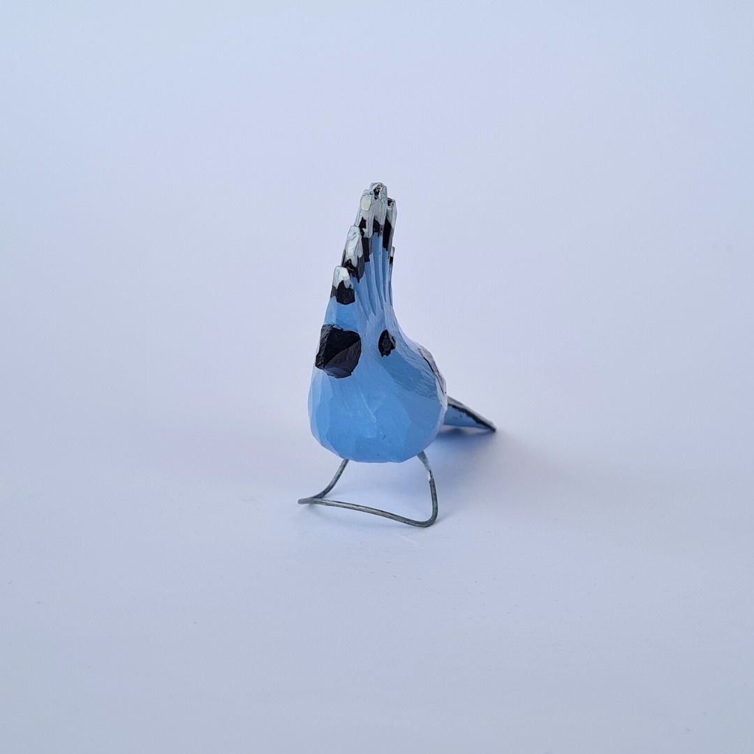 Ptak jest ręcznie wykonany z jednego kawałka drewna. Malowany farbami akrylowymi i lakierowany lakierem wodnym.